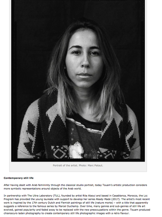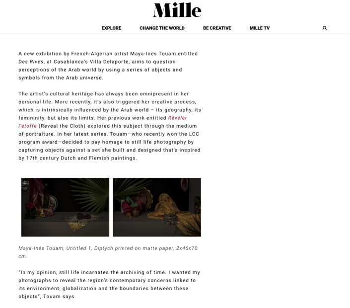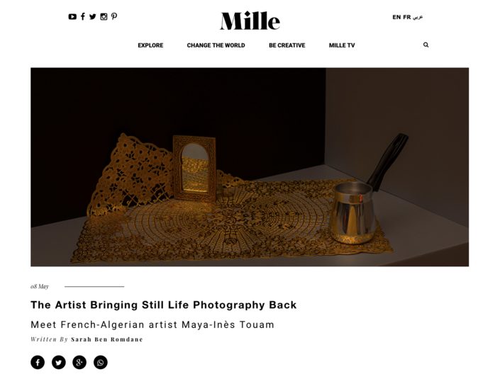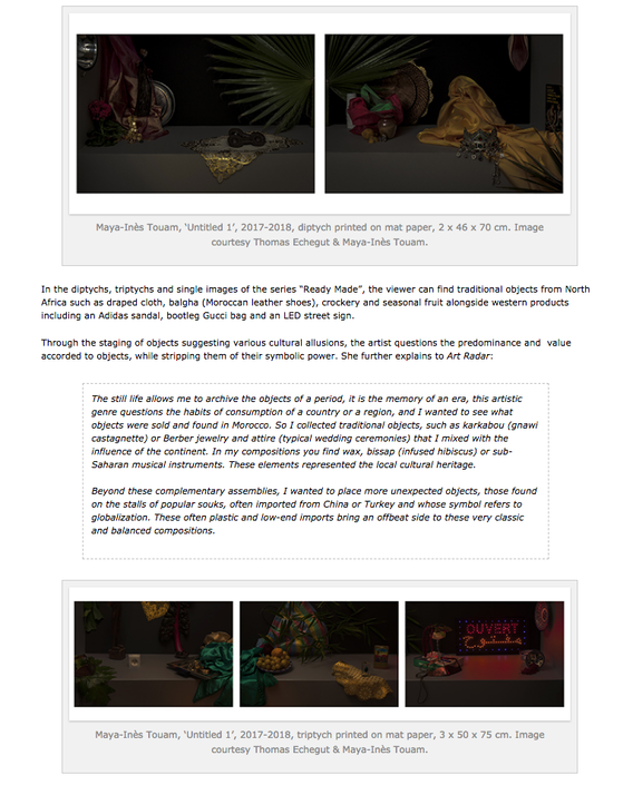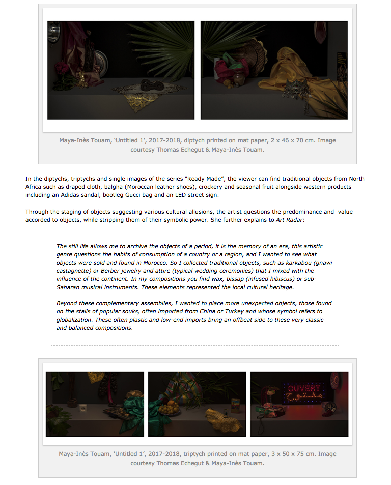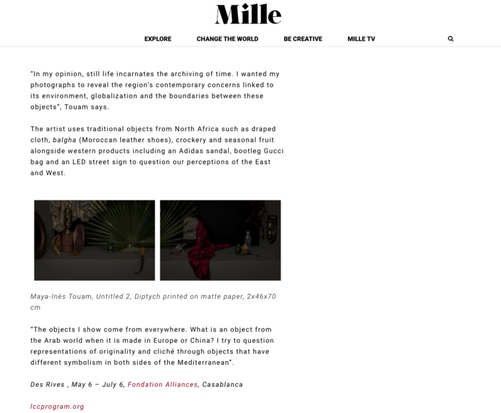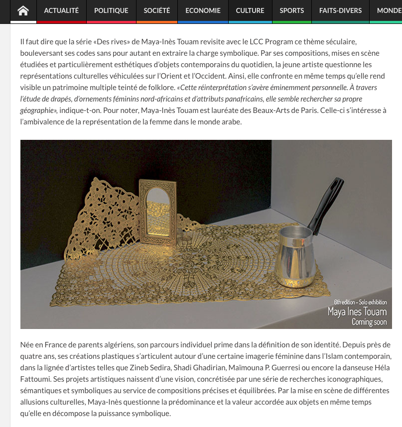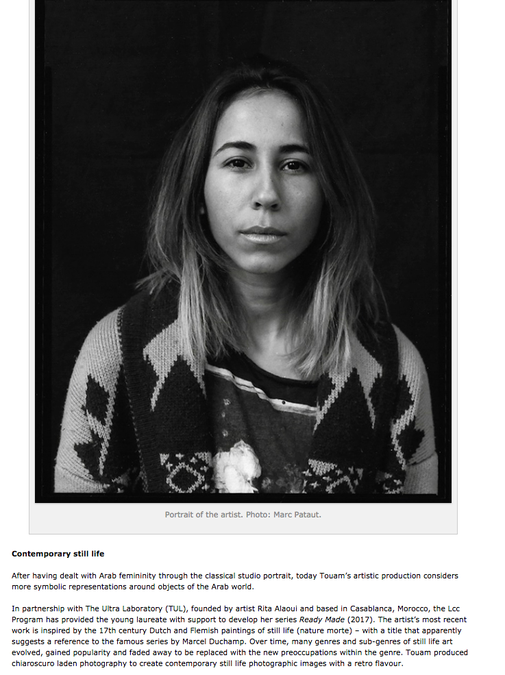 Maya-Inès Touam, récemment diplômée des Beaux-Arts de Paris, s’intéresse à l’ambivalence de la représentation de la femme dans le monde arabe. Née en France de parents algériens, son parcours individuel prime dans la définition de son identité. Depuis près de quatre ans, ses créations plastiques s’articulent autour d’une certaine imagerie féminine dans l’islam contemporain, dans la lignée d’artistes telles que Zineb Sedira, Shadi Gadirian, Maïmouna P. Guerresi ou encore la danseuse Héla Fattoumi. Par ses nombreux voyages dans les pays du MOAN et à travers différents médiums, elle questionne la féminité d’un Orient exposé aux codes de l’Occident, notamment au travers de sa série Révéler l’étoffe réalisée dans le cadre de sa thèse universitaire, avant de s’intéresser depuis 2017 à la nature morte. Ses projets artistiques naissent d’une vision, concrétisée par une série de recherches iconographiques, sémantiques et symboliques au service de compositions précises et équilibrées. Les photographies de Maya-Inès Touam ont été présentées lors d’expositions collectives aux Etats-Unis, en Europe et en Afrique du Nord, toujours accompagnée de Thomas Echegut, photographe formé par Marc Pataut et Patrick Feigenbaum. Pour sa première exposition individuelle, Maya-Inès Touam revisite avec le Lcc Program la nature morte, en bouleversant ses codes sans en extraire la charge symbolique. Elle questionne aussi les représentations culturelles véhiculées sur l’Orient et l’Occident à travers la mise en scène d’objets contemporains du quotidien.