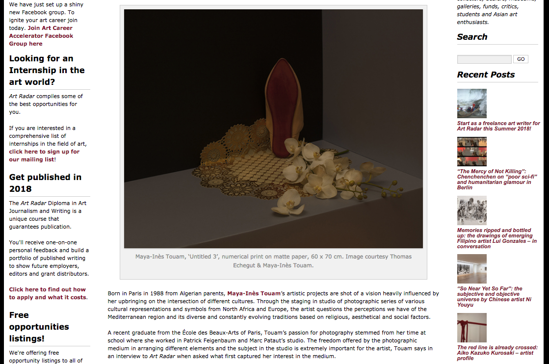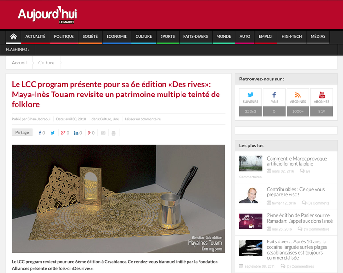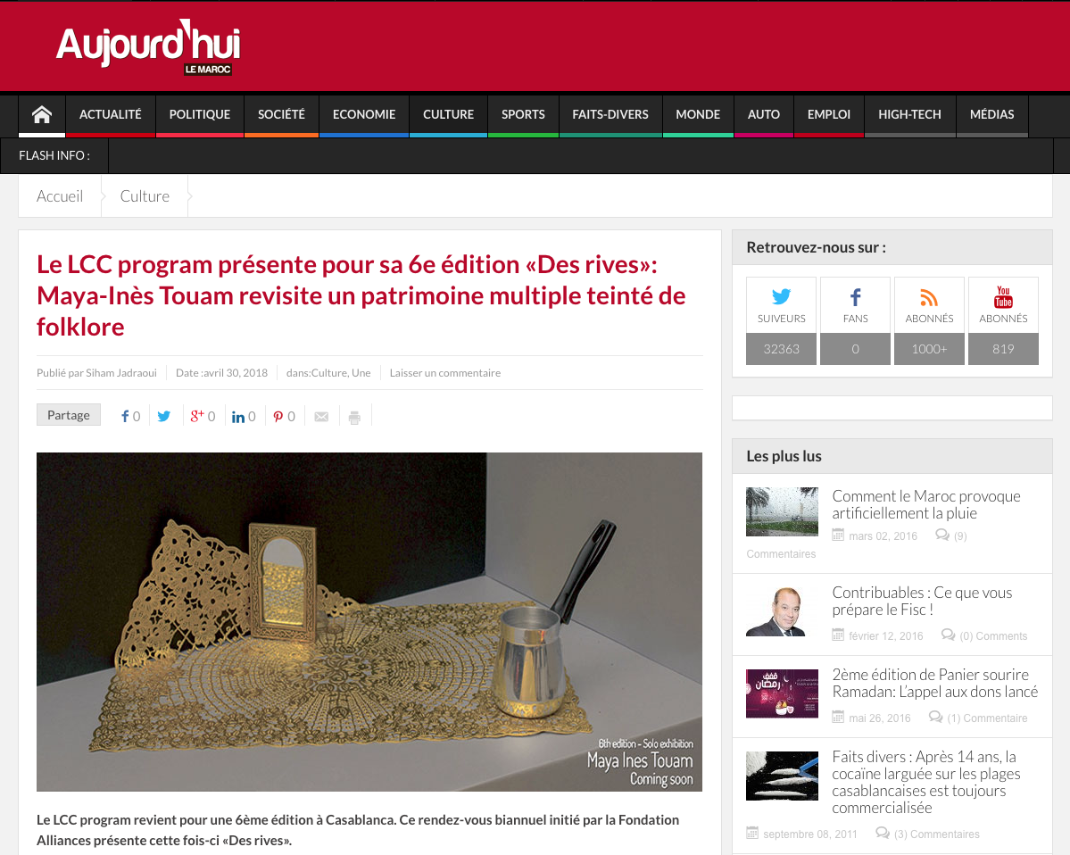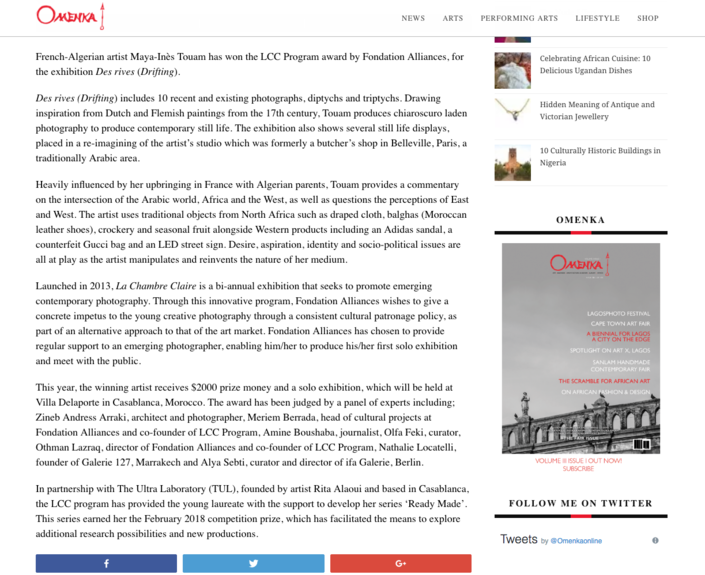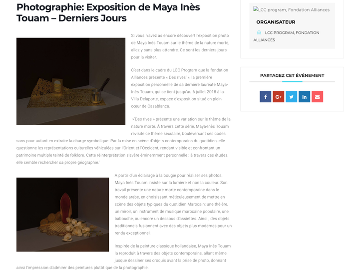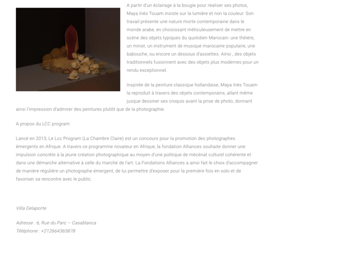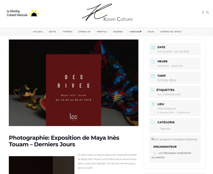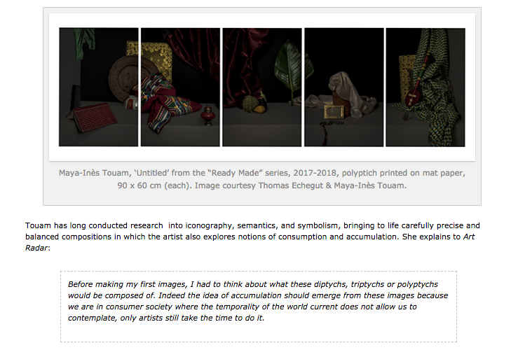 Maya-Inès Touam, récemment diplômée des Beaux-Arts de Paris, s’intéresse à l’ambivalence de la représentation de la femme dans le monde arabe. Née en France de parents algériens, son parcours individuel prime dans la définition de son identité. Depuis près de quatre ans, ses créations plastiques s’articulent autour d’une certaine imagerie féminine dans l’islam contemporain, dans la lignée d’artistes telles que Zineb Sedira, Shadi Gadirian, Maïmouna P. Guerresi ou encore la danseuse Héla Fattoumi. Par ses nombreux voyages dans les pays du MOAN et à travers différents médiums, elle questionne la féminité d’un Orient exposé aux codes de l’Occident, notamment au travers de sa série Révéler l’étoffe réalisée dans le cadre de sa thèse universitaire, avant de s’intéresser depuis 2017 à la nature morte. Ses projets artistiques naissent d’une vision, concrétisée par une série de recherches iconographiques, sémantiques et symboliques au service de compositions précises et équilibrées. Les photographies de Maya-Inès Touam ont été présentées lors d’expositions collectives aux Etats-Unis, en Europe et en Afrique du Nord, toujours accompagnée de Thomas Echegut, photographe formé par Marc Pataut et Patrick Feigenbaum. Pour sa première exposition individuelle, Maya-Inès Touam revisite avec le Lcc Program la nature morte, en bouleversant ses codes sans en extraire la charge symbolique. Elle questionne aussi les représentations culturelles véhiculées sur l’Orient et l’Occident à travers la mise en scène d’objets contemporains du quotidien.